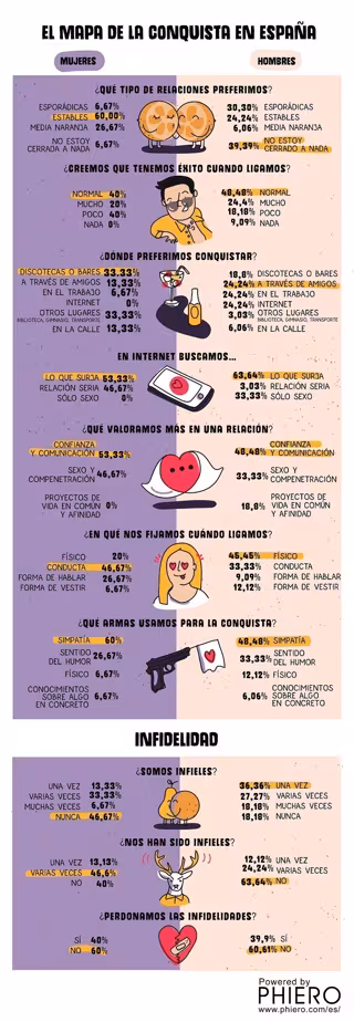 ¿Cómo somos los españoles cuándo de ligar se trata? ¿Nos diferenciamos del resto de Europa? Phiero, marca de perfumes con feromonas líder en Europa, ha realizado una encuesta a nivel europeo para descubrir qué tipos de relaciones preferimos, qué valoramos más cuando de conquistar se trata, cómo de fieles (o infieles) somos, en qué ambientes nos sentimos más cómodos al ligar y muchas otras cuestiones que desvelan cómo somos en el terreno del amor. ¿Preparados para descubrir el mapa de la conquista en España y Europa?