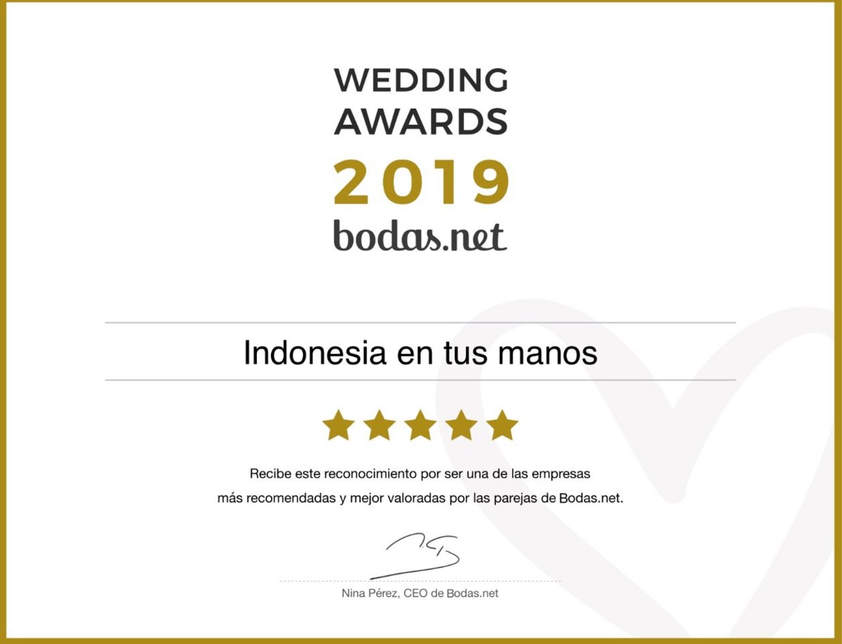 Indonesia en tus manos de Madrid ha recibido un Wedding Awards 2019, el galardón más prestigioso de las bodas, para la categoría Luna de Miel. Desde hace seis años, Bodas.net otorga estos premios a la excelencia en el servicio ofrecido por las empresas del sector nupcial de nuestro país, pero son las parejas las que lo hacen posible gracias a sus opiniones tras haber disfrutado de los servicios de los profesionales en sus bodas. Este premio se ha convertido en un referente en el sector y un sello de garantía para las parejas que organizan su boda a la hora de elegir proveedores para su gran día.