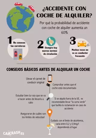 Los abogados de CarCrash.es, despacho especialista en reclamaciones online aseguran que "la probabilidad de colisión aumenta un 60% en coches de alquiler, ya que no se conocen las carreteras, normas de circulación, (en caso de alquiler en el extranjero), y muchas de las personas que deciden alquilar, no son conductores frecuentes". Gonzalo García, CEO de Carcrash.es, explica que "siempre que alquilemos un coche o moto debemos tener en cuenta los riesgos añadidos para evitar accidentes en carretera, lo primero que se ha de saber cuando alquilas un coche es que en el contrato de alquiler del vehículo está incluido el seguro obligatorio a terceros, éste es un seguro básico que cubre los daños causados a otro vehículo".