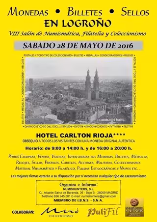 El VIII Salón de Numismática, Filatelia y Coleccionismo tendrá lugar el sábado 28 de Mayo en los salones del Hotel Carlton Rioja****, situado en Gran Vía del Rey D. Juan Carlos I nº 5, en horario de 09:00 a 14:00 y de 16:00 a 20:00, la asistencia es totalmente gratuita, asimismo, y como agradecimiento a la asistencia al evento la organización obsequiará a todos los visitantes con una moneda auténtica.