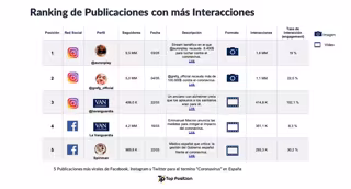 Top Position ha realizado un estudio sobre la viralidad de publicaciones relacionadas con el coronavirus en Facebook, Twitter e Instagram, analizando las publicaciones con más interacción en cada una de estas redes sociales. Instagram es la red social más viral, alcanzando con las primeras diez publicaciones los 4,5 millones de interacciones, seguida de Facebook con 1,6 millones millones y Twitter con 382.000 interacciones