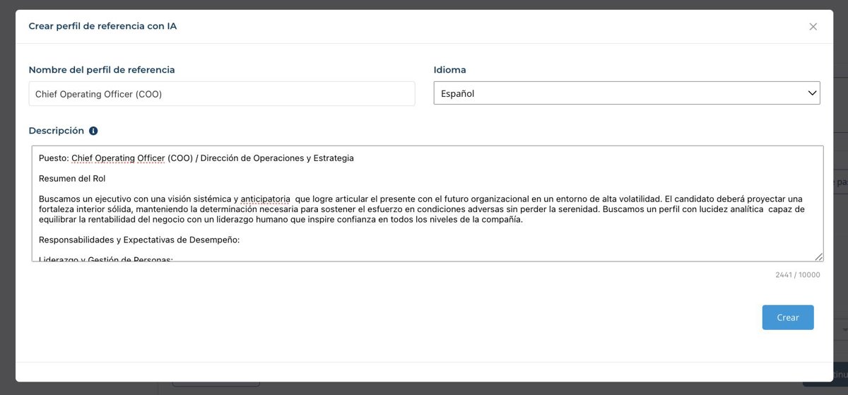 A partir de este análisis, el sistema genera, en menos de 30 segundos, un perfil de referencia ideal, compuesto por entre 8 y 12 soft skills clave para el desempeño del rol. Cada una de estas habilidades va acompañada de una justificación detallada que explica su relevancia y su relación directa con las funciones del puesto. El perfil resultante es editable y puede adaptarse fácilmente al contexto y a los criterios específicos de cada organización.