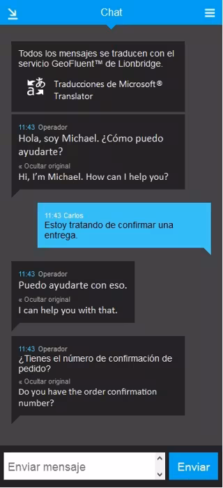 Con las capacidades de chat en vivo de BoldChat, la integración con traducciones en tiempo real de Lionbridge GeoFluent permite a los equipos de ventas y servicio al cliente dirigirse a los consumidores online y desde sus dispositivos móviles en su lengua materna traduciendo al instante las conversaciones online. Como resultado, las empresas multinacionales -o incluso las empresas con carteras de clientes de distintos países y con distintas lenguas- pueden ampliar significativamente su cobertura, aumentar la fidelización a su marca y conseguir un servicio de atención al cliente muy rentable sin importar dónde se encuentre, qué tipo de dispositivo esté utilizando o qué idioma hable.