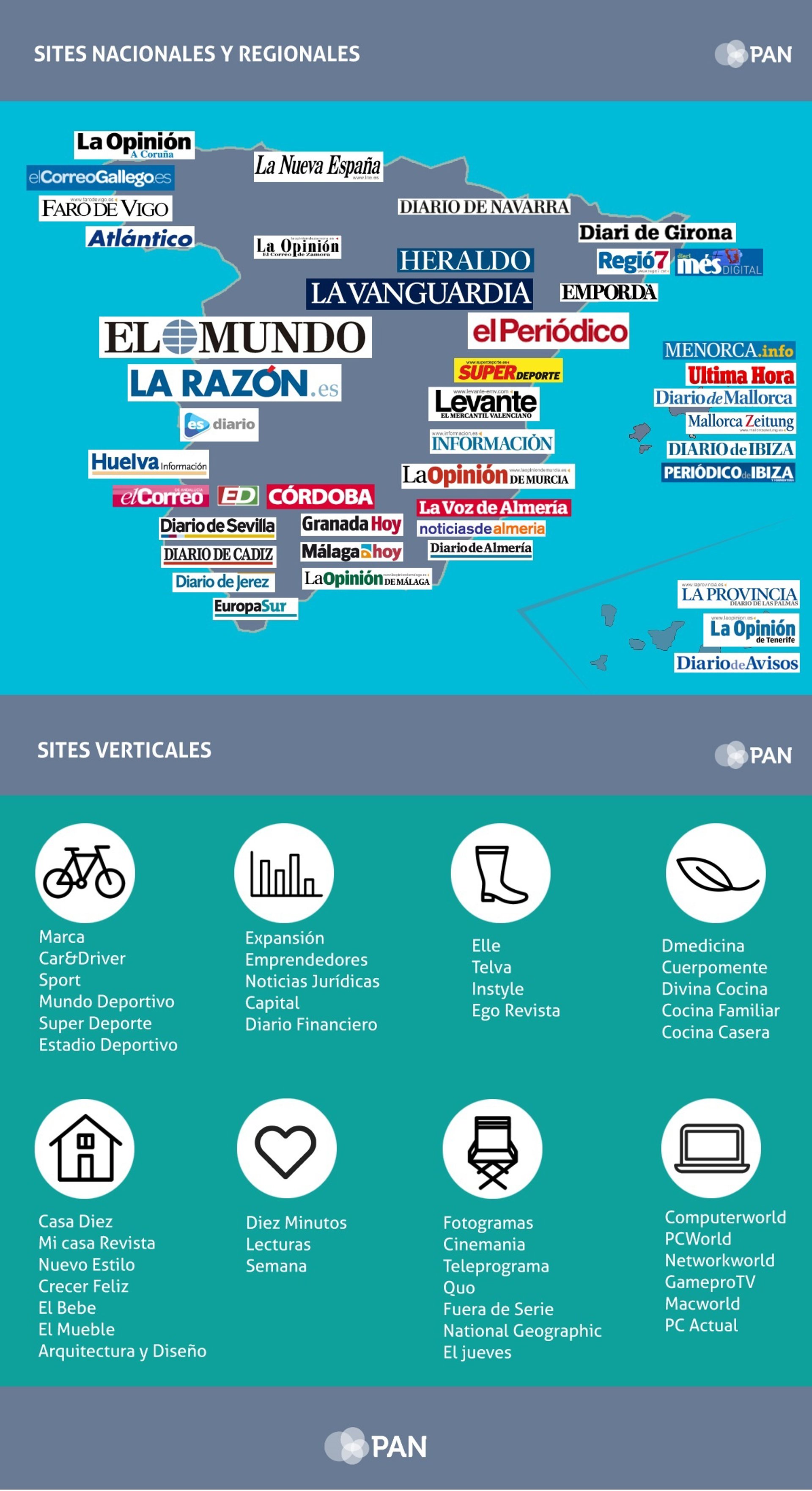 Dentro de la red exclusiva de soportes de PAN se encuentran, entre otros, Unidad Editorial, Grupo Zeta, Hearst, Grupo Godó, Grupo Joly, Editorial Prensa Ibérica, La Razón o Grupo RBA, aglutinando cabeceras de primera línea como: El Mundo, La Vanguardia, Expansión, Marca, Telva, Elle, AR-Revista, Nuevo Estilo, Emprendedores, La Nueva España, entre otros.