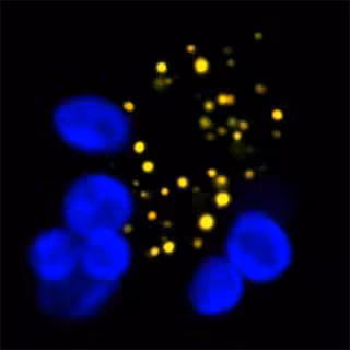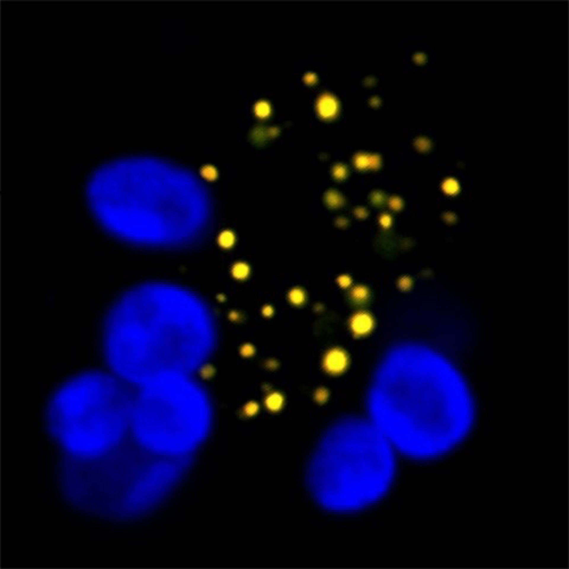 Núcleo de una célula de tabaco, obtenida por microscopía confocal, donde se pueden ver los cuerpos nucleares que contienen el complejo DELLA-COP1 en amarillo. La autofluorescencia de los cloroplastos aparece en azul. - EUGENIO G. MINGUET.