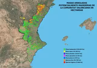 Mapa de las masas potencialmente madereras de la Comunitat Valenciana obtenido por el proyecto 'Woodforest Satelite' de Aidimme, que empleará herramientas de teledetección para favorecer la gestión y explotación sostenible de los montes - AIDIMME