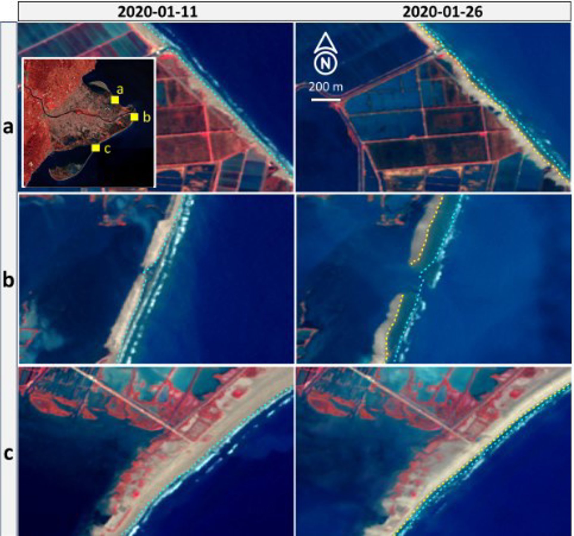 En su estudio, los investigadores de la UPV caracterizaron los cambios de posición de la línea de costa de forma automática a partir de las imágenes de satélite Sentinel-2 (de la Agencia Espacial Europea, ESA) y Landsat 8 (del Servicio geológico de los Estados Unidos, USGS y de la NASA), empleando la herramienta SAET -acrónimo en inglés de Shoreline Analysis and Extraction Tool.