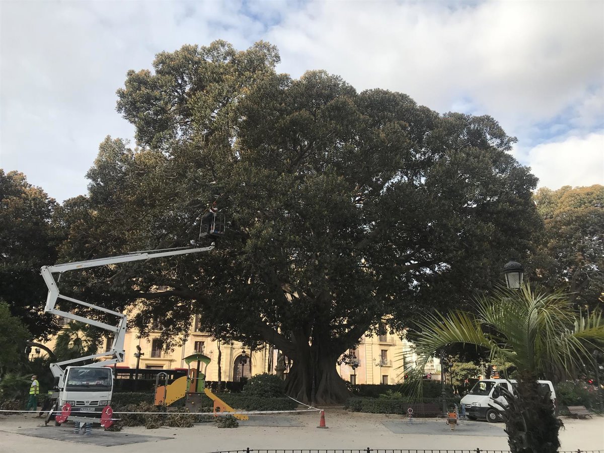 Se trata de los ejemplares monumentales de Ficus macrophylla emplazados en el Parterre, la Glorieta o la Alameda. Los trabajos consisten en la inspección y poda selectiva, la revisión de la estructura arbórea y otras acciones para reducir el riesgo de rotura de ramas.
