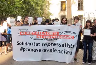 Los jóvenes se han reunido a las 11.00 horas frente al instituto de secundaria y han desplegado una pancarta con el lema 'Ni retallades ni repressió. Solidaritat represssaliats #primavera valenciana', al tiempo que han exhibido las propuestas de multa que han recibido. Posteriormente, una joven ha leído un manifiesto en el que el colectivo considera que el objetivo de las denuncias es "provocar miedo entre las personas y servir de medida ejemplarizante para otros sectores de la sociedad".