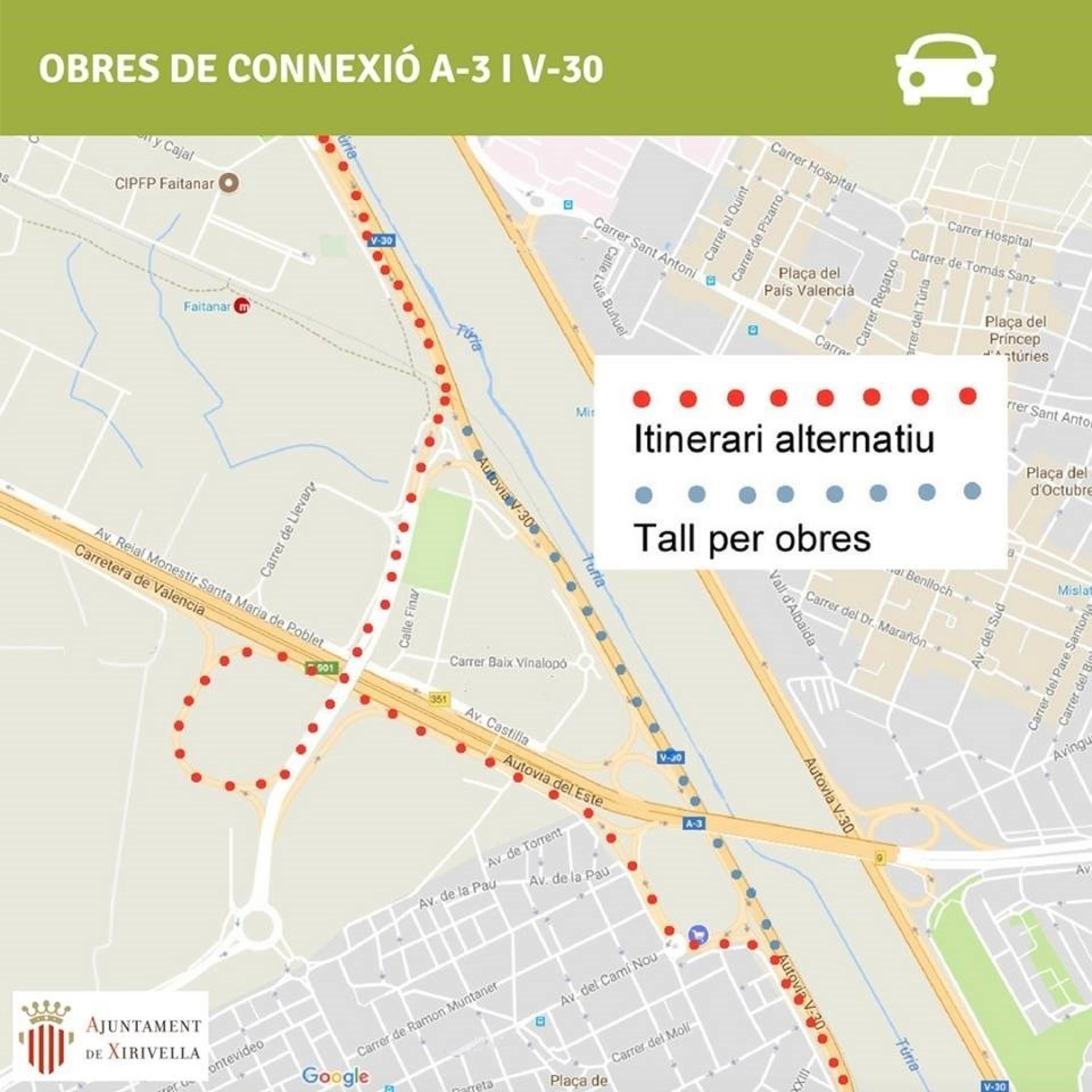 La medida entró en vigor este pasado viernes con el correspondiente desvío por la vía auxiliar en la plaza de España de la localidad, que "recupera" así la salida a la V-30 en dirección al puerto de València, según ha informado en su cuenta de Facebook el Ayuntamiento de Xirivella, tras recibir la comunicación de Demarcación de Carreteras.