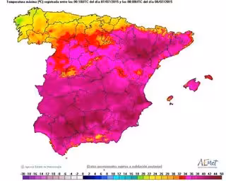 Las temperaturas máximas de este martes en España se registraron en la localidad valenciana de Xàtiva, donde se alcanzaron los 45,9ºC y los 44,9º de Ontinyent, mientras que para este miércoles está previsto un descenso "notable" de las temperaturas en esta provincia y no superarán los 34º, según Aemet.