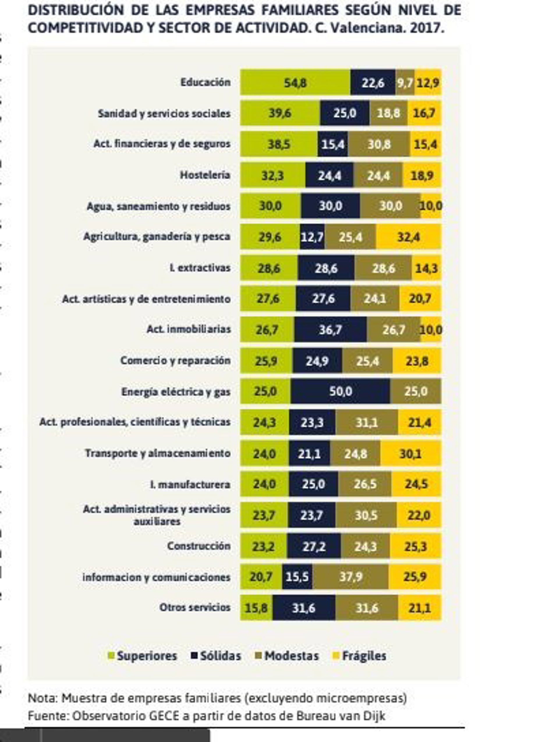 En concreto, las empresas familiares valencianas de los sectores de educación, sanidad, el sector financiero y hostelería se caracterizan por unos niveles de competitividad elevados, con más del 50% de las compañías en el grupo de las "superiores o sólidas".