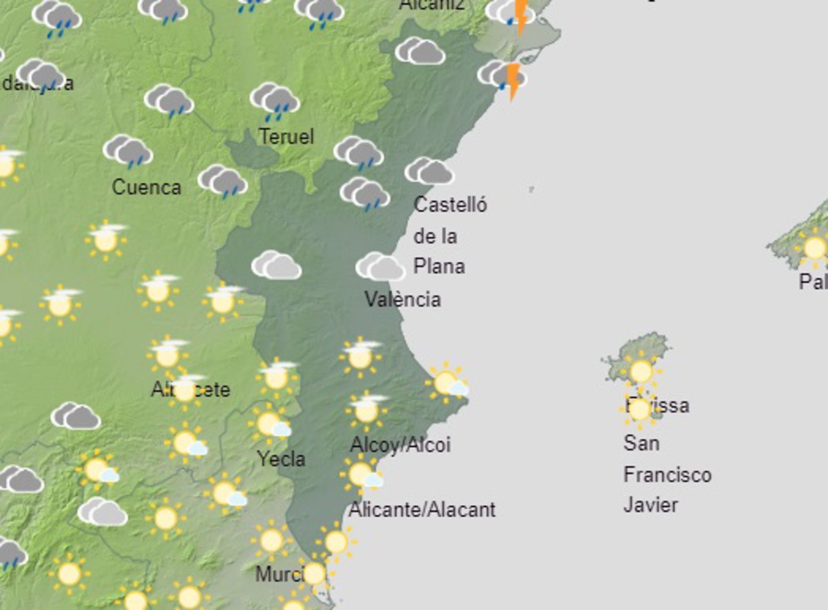 La Comunitat Valenciana vivirá una jornada electoral marcada por los cielos nubosos y con probabilidad de chubascos y tormentas en el interior de la mitad norte a primeras horas del día, que podrán ser localmente fuertes y que se podrían extender al litoral norte, aunque con menor intensidad, según la predicción de la Agencia Estatal de Meteorología (Aemet).