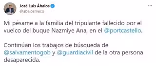 El titular de Transportes, Movilidad y Agenda Urbana, en un mensaje publicado en su cuenta de la red social Twitter, ha expresado su pésame a la familia del hombre de 22 años, miembro de la tripulación del carguero 'Nazmiye Ana'. El cuerpo sin vida de este joven, de nacionalidad india, fue encontrado este sábado por la tarde por los efectivos del dispositivo de búsqueda desplegado en el Puerto.