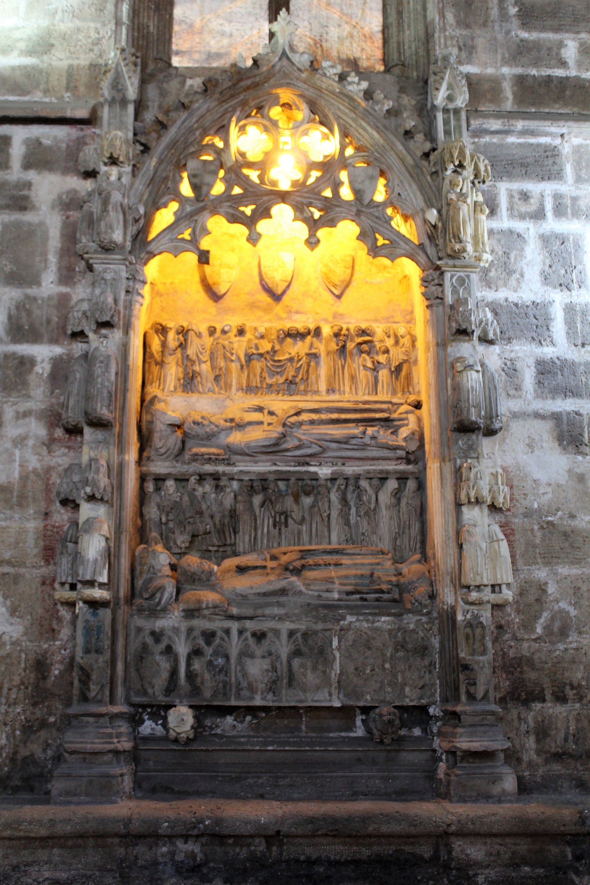 El conjunto del sepulcro, que se articula por medio de dos columnas que sustentan una arquivolta, posee una cineraria, una estatua yacente inferior, friso inferior, estatua yacente superior y friso superior.
