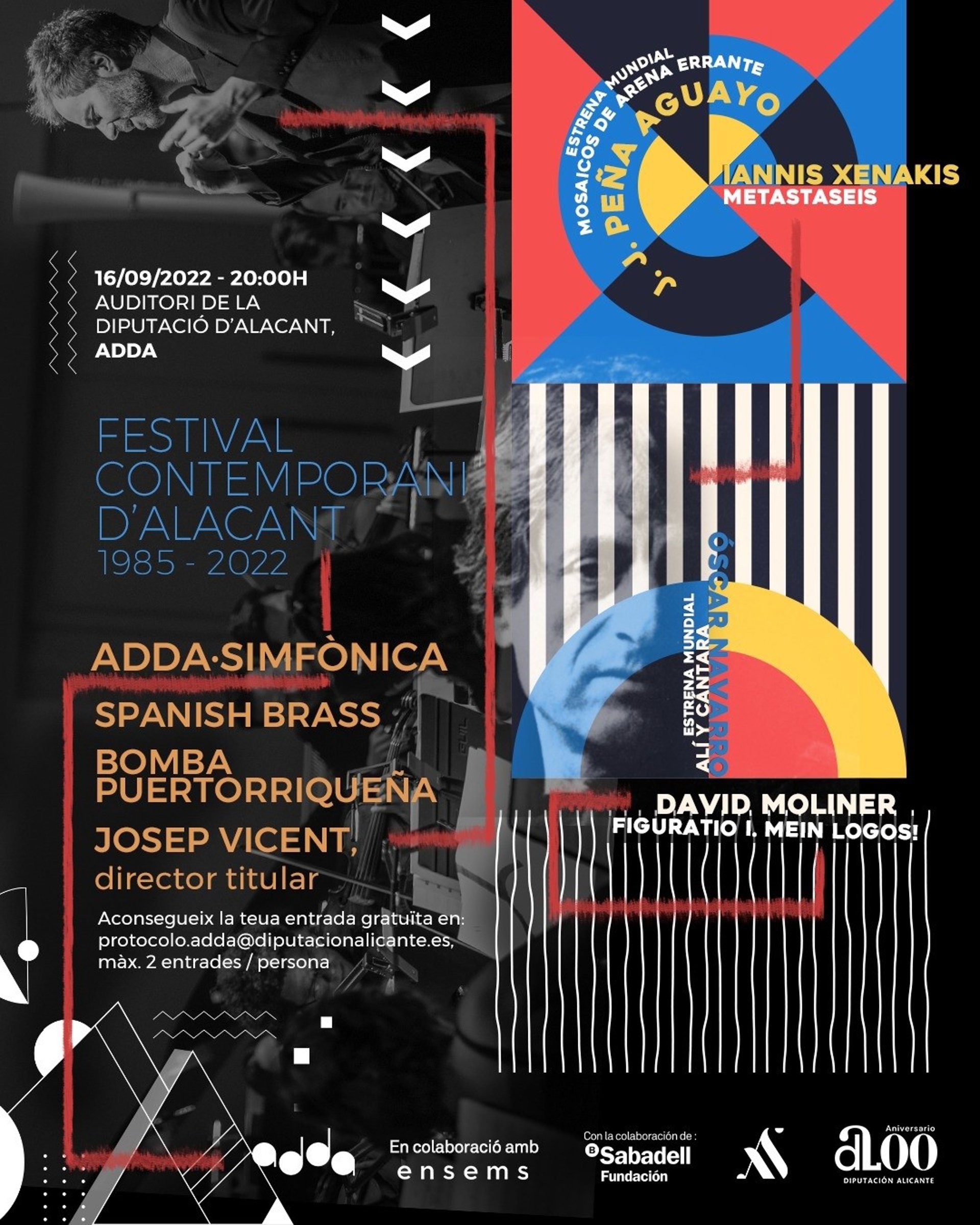 Bajo el título 'Metástasis', las dos primeras actuaciones tendrán lugar el 16 de septiembre en Alicante y el 18 en Valencia, donde AddaSimfnica participará en el festival Ensems. La orquesta alicantina actuará estos dos días bajo la dirección de Josep Vicent y junto al quinteto de metales Spanish Brass, premio nacional de música, el percusionista David Moliner y un grupo de bomba puertorriqueña.