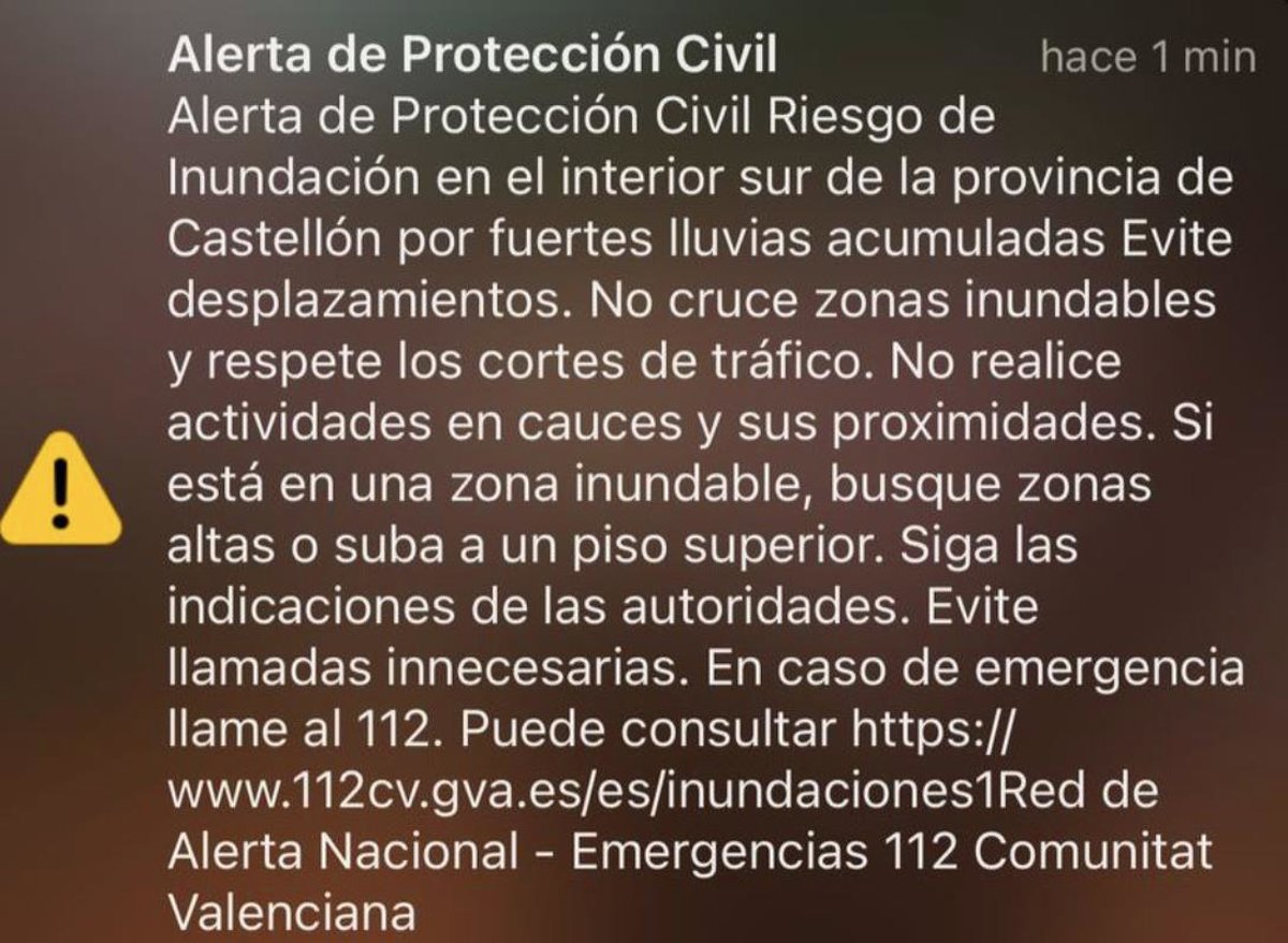 El texto del mensaje es: "Alerta de Protección Civil Riesgo de inundación en el interior sur de la provincia de Castellón por fuertes lluvias acumuladas. Evite desplazamientos. No cruce zonas inundables y respete los cortes de tráfico. No realice actividades en cauces y sus proximidades. Si está en una zona inundable, busque zonas altas o suba a un piso superior". Asimismo, recomienda seguir las indicaciones de las autoridades.