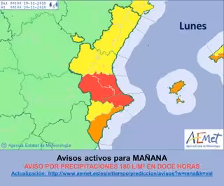 Según ha informado la Agencia en su cuenta de Twitter, en las próximas 36 horas habrá una "meteorología muy adversa" en la Comunitat Valenciana, particularmente en estas zonas y el litoral sur de Alicante, que estará en aviso naranja.