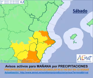 La Agencia Estatal de Meteorología (Aemet) mantiene para este sábado en la Comunitat Valenciana alertas naranja y amarilla en diversas zonas de la mitad sur ante el riesgo de precipitaciones que pueden acumular de 60 a 100 litros por metro cuadrado en doce horas y de 20 litros por metro cuadrado en una hora en el sur de Alicante, según informa este organismo a través de su cuenta de Twitter.