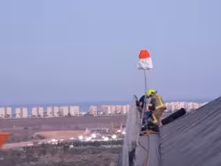Dos bomberos trabajan sobre la cornisa del aeropuerto con la playa de Urbanova al fondo. - AYTO ALICANTE