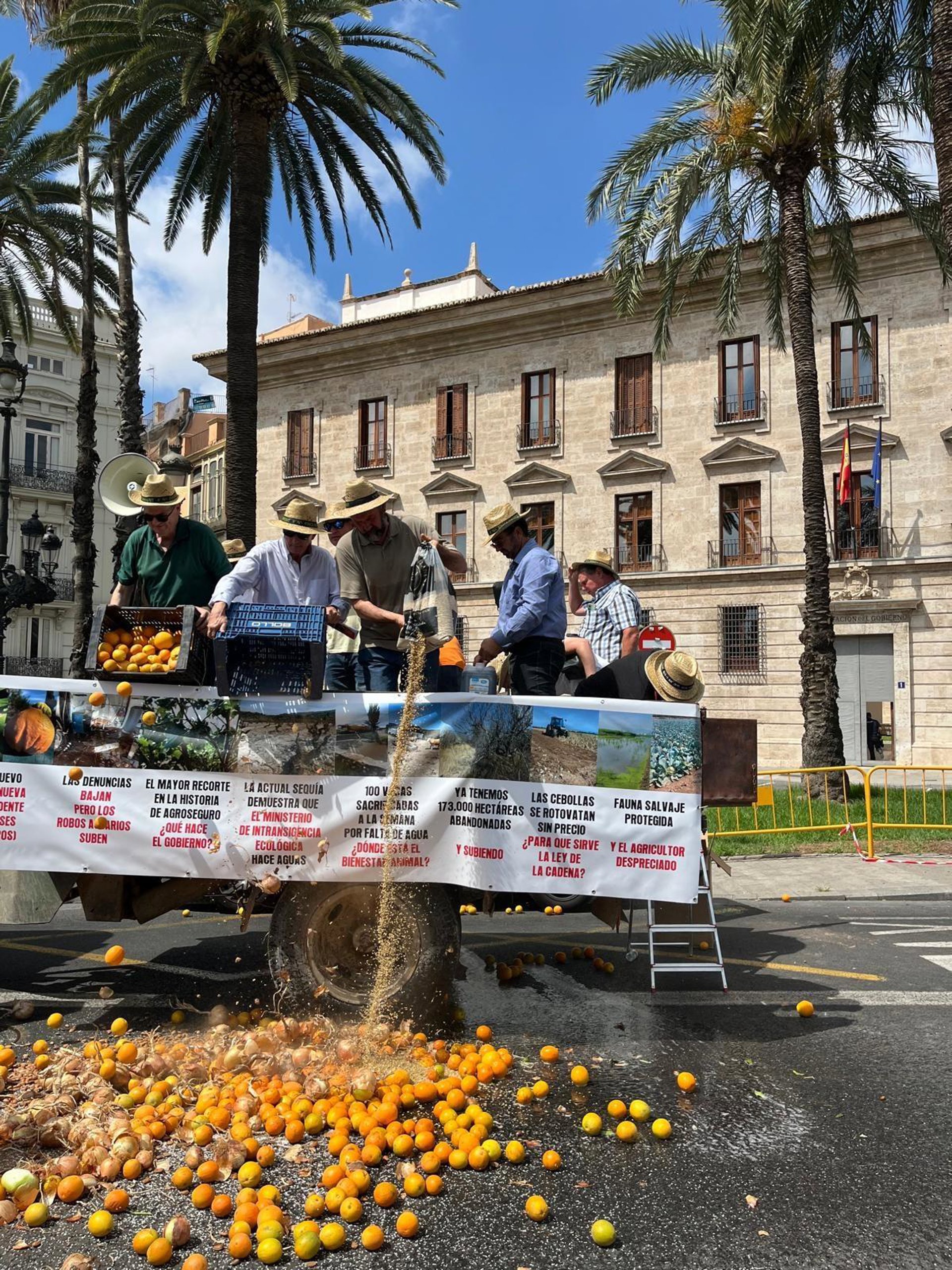 Por último, la protesta ha concluido con el lanzamiento de productos valencianos en "grave crisis de rentabilidad" como cítricos, cebollas, vino, almendras, cereales o arroz.
