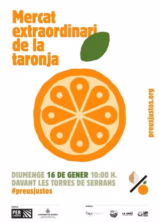 El mercado extraordinario de la naranja forma parte de la campaña 'Precios Justos', a la cual se ha adherido el Ayuntamiento de Valncia, que está impulsada por Per l'Horta, junto con una quincena de organizaciones agrarias, agraristas, ecologistas y de consumidores. Se trata de la segunda edición, después de un mercado extraordinario de la cebolla y la patata, realizado en junio con un gran éxito de público.