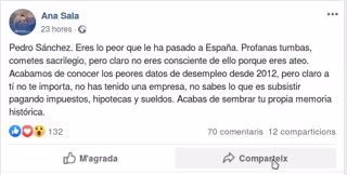 Sala, en un mensaje publicado este jueves en Facebook y que acumula más de 130 valoraciones --la mayoría de ellas positivas--, asegura: "Profanas tumbas, cometes sacrilegio, pero claro no eres consciente de ellos porque eres ateo".