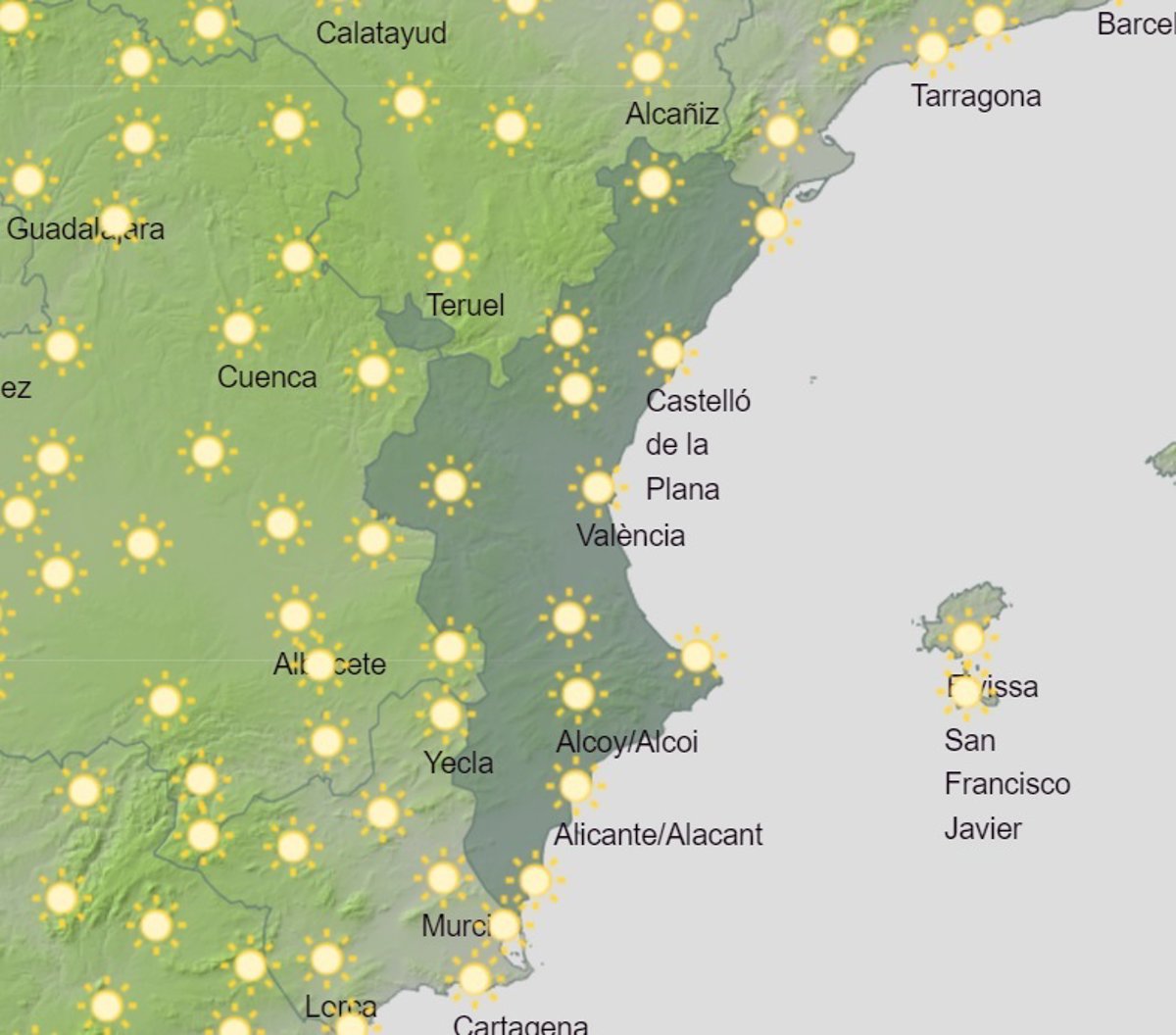 Finalmente, en Alicante, se esperan máximas de 36 en Orihuela, 35 en Alcoi, 33 en Elx, 32 en Dénia y 31 en Alicante. Las mínimas serán de 20 en Alcoi, Elx y Orihuela, 21 en Dénia y 22 en Alicante.