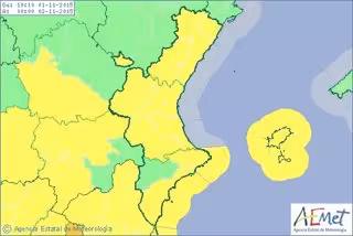 La Comunitat Valenciana se encuentra en alerta amarilla (riesgo) por lluvias intensas y rachas de viento fuerte. Así, en la jornada de este domingo se darán chubascos persistentes que podrán ser localmente fuertes. En la costa de Alicante, además, habrán intervalos de viento fuerte del nordeste, según la predicción de la Agencia Estatal de Meteorología (Aemet).