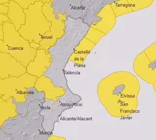 En el caso de la provincia de Castellón, entre las 12.00 y las 23.59 horas permanecerá activo el aviso amarillo por fenómenos costeros. En el litoral norte y sur se espera viento del suroeste de 50 a 60 km/h (fuerza 7) y olas de 2 a 3 metros, principalmente mar adentro.