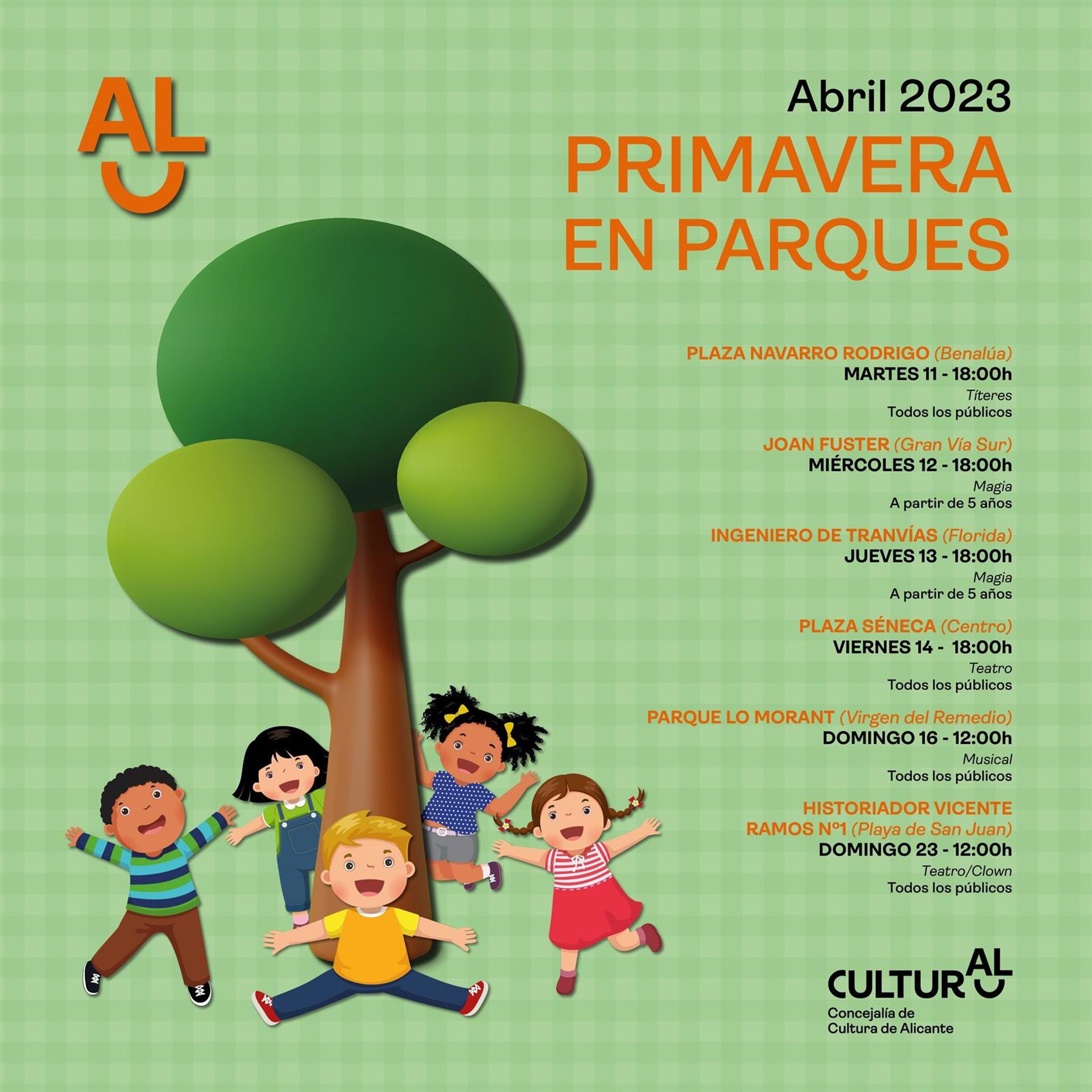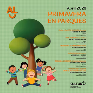 La Concejalía de Cultura del Ayuntamiento de Alicante celebra una nueva edición del programa 'Primavera en Parques', que se desarrollará entre el 11 y el 23 de abril con actividades de magia, teatro o títeres para toda la familia en diferentes plazas y parques de la ciudad.