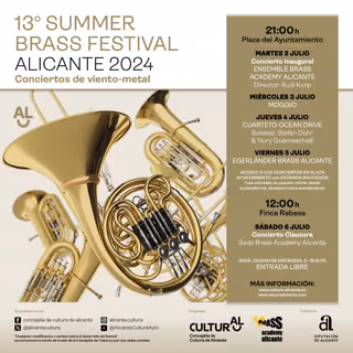 Por su parte, la decimotercera edición de 'Summer Brass Festival' llenará de música la plaza del Ayuntamiento entre este martes y el próximo sábado día 6, con actuaciones de jazz a las 21.00 horas. Los interesados pueden obtener sus entradas gratuitas en la plataforma Alicante Música. El Concierto Inaugural será el de Ensemble Brass de Academy Alicante, dirigido por Rudi Korp.