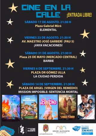 El Ayuntamiento de Alicante, en colaboración con el Festival Internacional de Cine de Alicante, ha preparado para la segunda quincena de agosto y la primera de septiembre una nueva edición de 'Cine en la calle', con cinco proyecciones gratuitas de películas de actualidad para todos los públicos que podrán verse en cinco espacios diferentes de la ciudad.