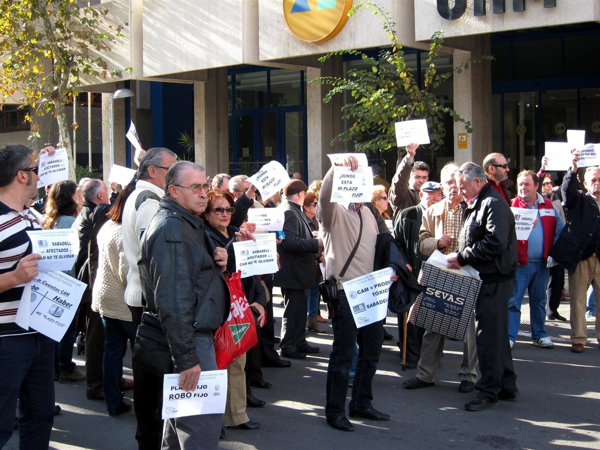 Alrededor de un centenar de personas se han concentrado este jueves frente a la sede central de CAM, en Alicante, convocados por Adicae en protesta por la venta de "productos tóxicos" por parte de la entidad financiera a los ahorradores.