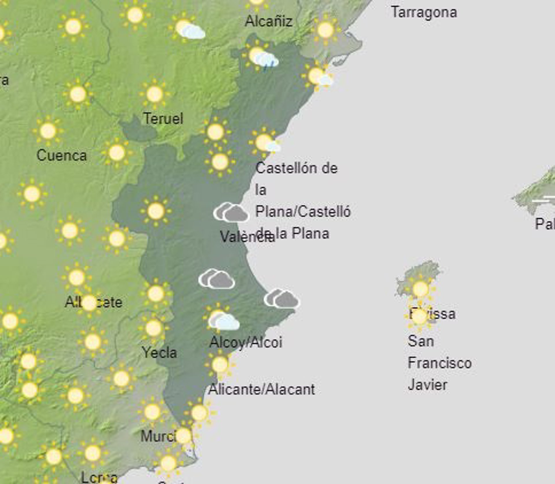Los cielos poco nubosos o despejados, con nubosidad baja matinal en zonas litorales e interior sur de Valencia, tenderán a partir del mediodía a intervalos nubosos y la nubosidad de evolución en zonas de montaña del tercio norte podrá dejar chubascos y tormentas ocasionales en el interior de Castellón.