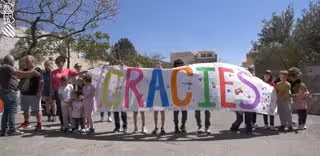 Los menores han desplegado una gran pancarta con la palabra 'Grcies', acompañada con dibujos de camiones de bomberos, helicópteros realizando descargas contra el fuego y corazones, entre otros diseños.