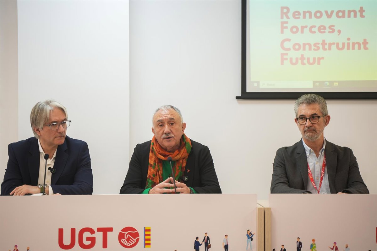 El recién elegido secretario general de UGT-PV, Tino Calero (1i) y el secretario general de UGT, Pepe Álvarez (c), durante la clausura del X Congreso Nacional de UGT PV, en la Casa del Pueblo de UGT PV, a 4 de abril de 2025, en Valencia - Jorge Gil - Europa Press