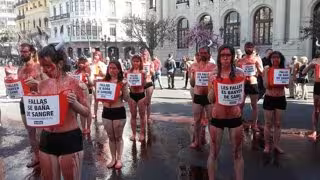 Una veintena de antitaurinos de la organización iberoamericana por los derechos de los animales AnimaNaturalis se han bañado semidesnudos en sangre artificial este domingo en la plaza del Ayuntamiento de València para reivindicar que las Fallas "no son excusa para maltratar a nadie".