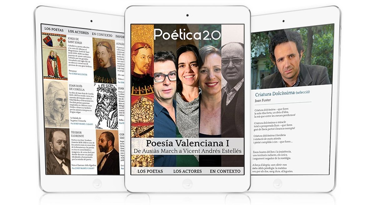 Poética 2.0 es un proyecto que une las letras, la interpretación y la tecnología para llevar la literatura española ante la audiencia global de la era digital. Tras la primera entrega de poesía en valenciano que abre la colección, habrá más apps sobre poesía valenciana en castellano, con autores como Gil-Albert, Miguel Hernández, José Albi y María Beneyto, y contemporánea, con Francisca Aguirre, César Simón, Francisco Brines, Jaime Siles, Rafael Soler, Carlos Marzal o Vicente Gallego.