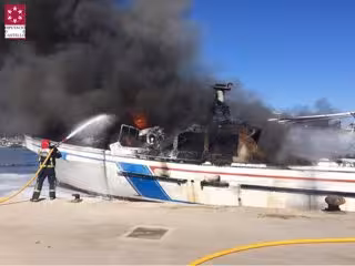 Efectivos de bomberos trabajan en las tareas de extinción del incendio de una embarcación de pesca amarrada en el puerto de Benicarló (Castellón), que no se ha propagado al resto de barcos, según ha informado el Consorcio Provincial de Bomberos a través de Twitter.