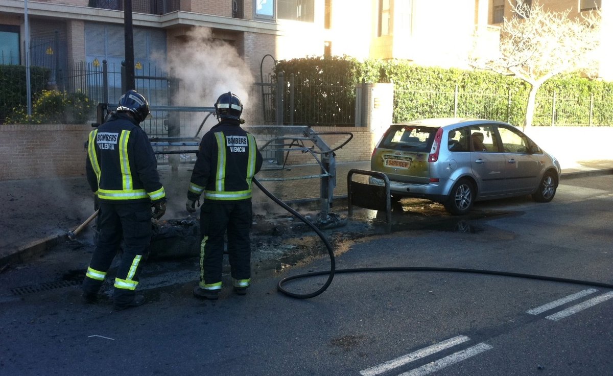 Dos contenedores situados a la altura del número 4 de la calle Serranía de Valencia, en el barrio de Beniferri, han quedado completamente calcinados en la mañana de este jueves. Asimismo, el fuego ha afectado a un coche aparcado junto a ellos.