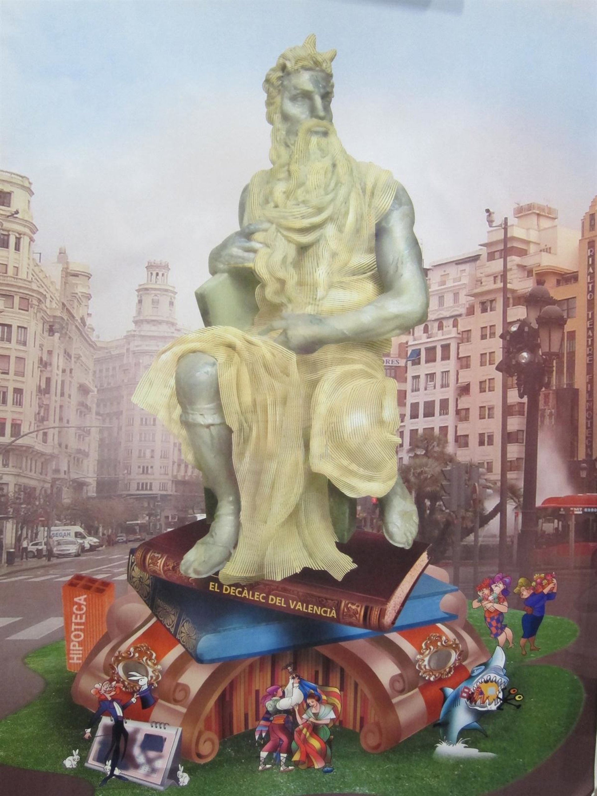 La figura central del monumento grande tendrá una altura de 14,80 metros y estará hecha en parte con la técnica de varillas de madera que ha caracterizado muchos trabajos de García. Además, esta falla contará con otros 28 'ninots' situados alrededor del Moisés central que mostrarán esos diez mandamientos, entre ellos, el de "amarás y honrarás a tu tierra".