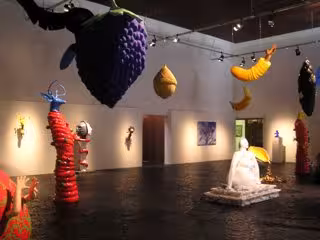 Lussanet llena el espacio expositivo con más de treinta obras, entre esculturas en el suelo, diversos cuadros y un evocador bosque de frutas colgadas, que destacan por un intenso colorido y gran variedad de formas y tamaños, sorpresa y curiosidad.