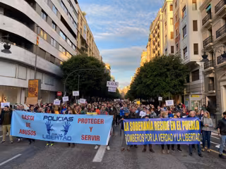 Una manifestación convocada por la asociación 'Policías por la Libertad' ha recorrido este sábado las calles del centro de Valncia contra la "imposición de la mascarillas" y la gestión del coronavirus por parte del Gobierno.