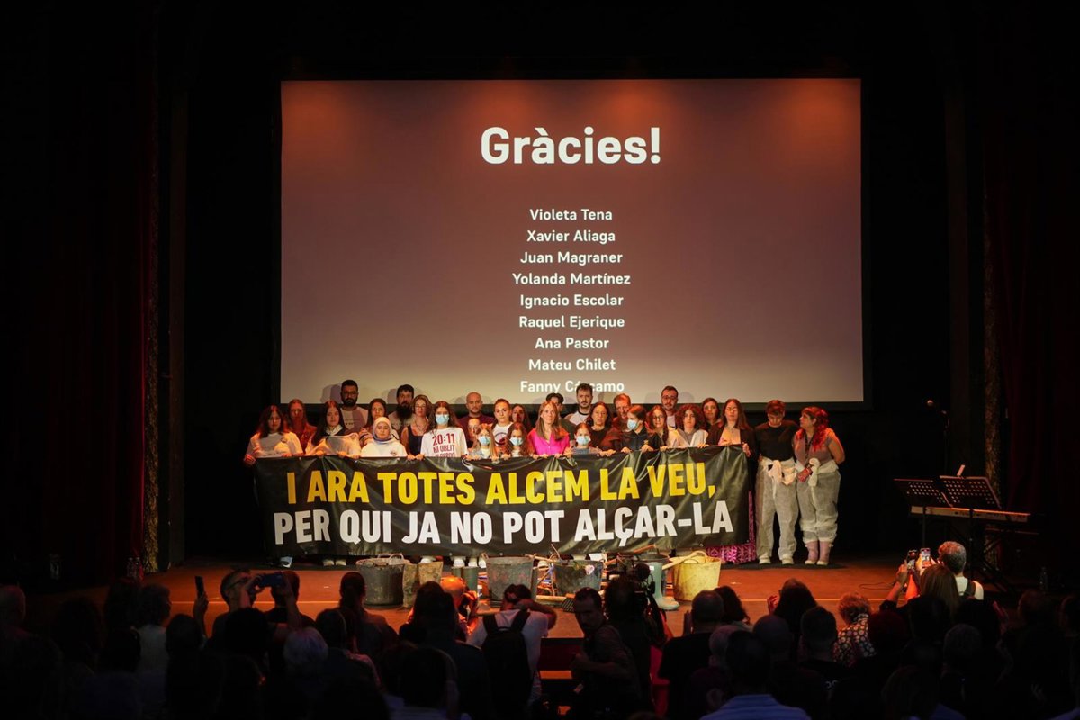 Entre aplausos y lágrimas, han depositado sobre el suelo del escenario escobas, botas y cubos manchados de barro como símbolos de la tragedia. Todos ellos han portado una pancarta con el mensaje "I ara tots alcem la veu per qui ja no pot alçarla", y han coreado 'Mazón, dimisión' junto al resto del público.