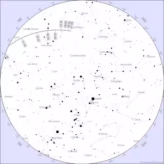 Unos minutos después, entre las 21.15 y las 21.25, el asteroide transitará por el cúmulo de la Cabellera de Berenice. Para quienes puedan disfrutar de un horizonte despejado y transparente, este será el mejor momento de la observación. Con una elevación de entre 10 y 15 grados y una magnitud aún inferior a la octava, la roca se moverá sobre el rico y denso campo estelar de este cúmulo abierto, siendo todavía fácilmente visible con los prismáticos.