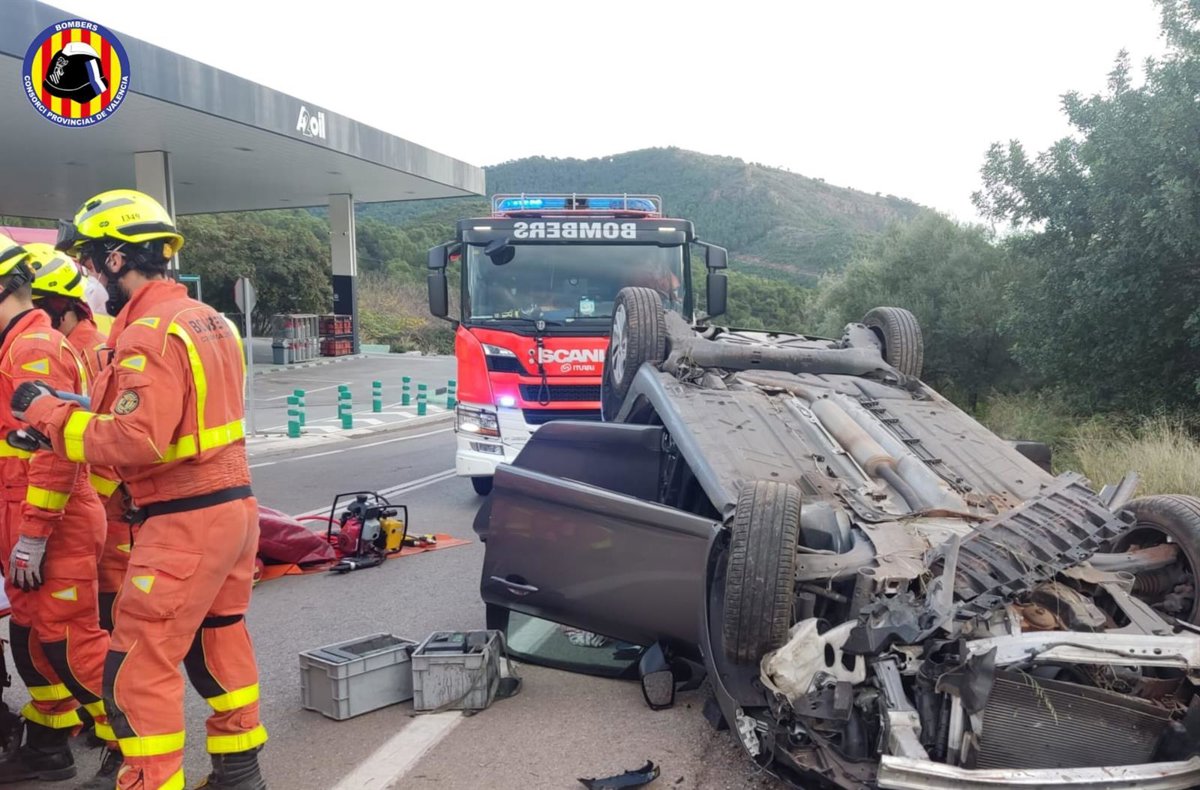Efectivos del Consorcio de Bomberos de Valencia han atendido este viernes a un hombre y una mujer tras volcar su vehículo en la carretera CV-310 en el término municipal de Serra.