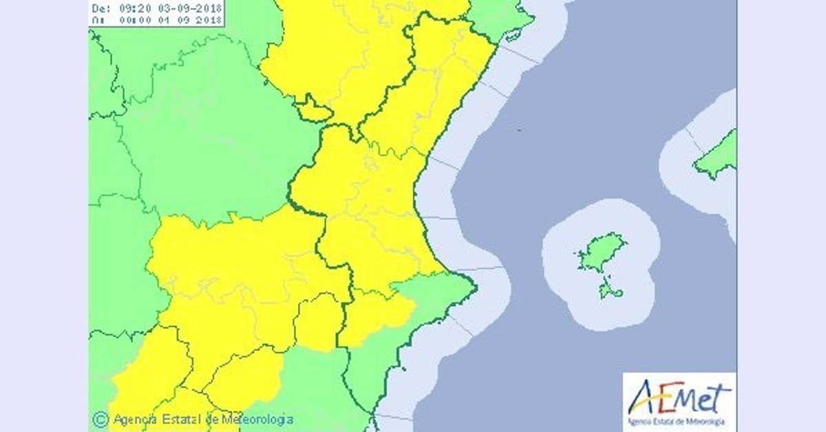 La Agencia Estatal de Meteorología (Aemet) ha extendido el aviso amarillo por lluvias y tormentas, que podrían ser localmente fuertes y con granizo, a toda la provincia de Castellón y Valencia, así como al interior norte de Alicante.