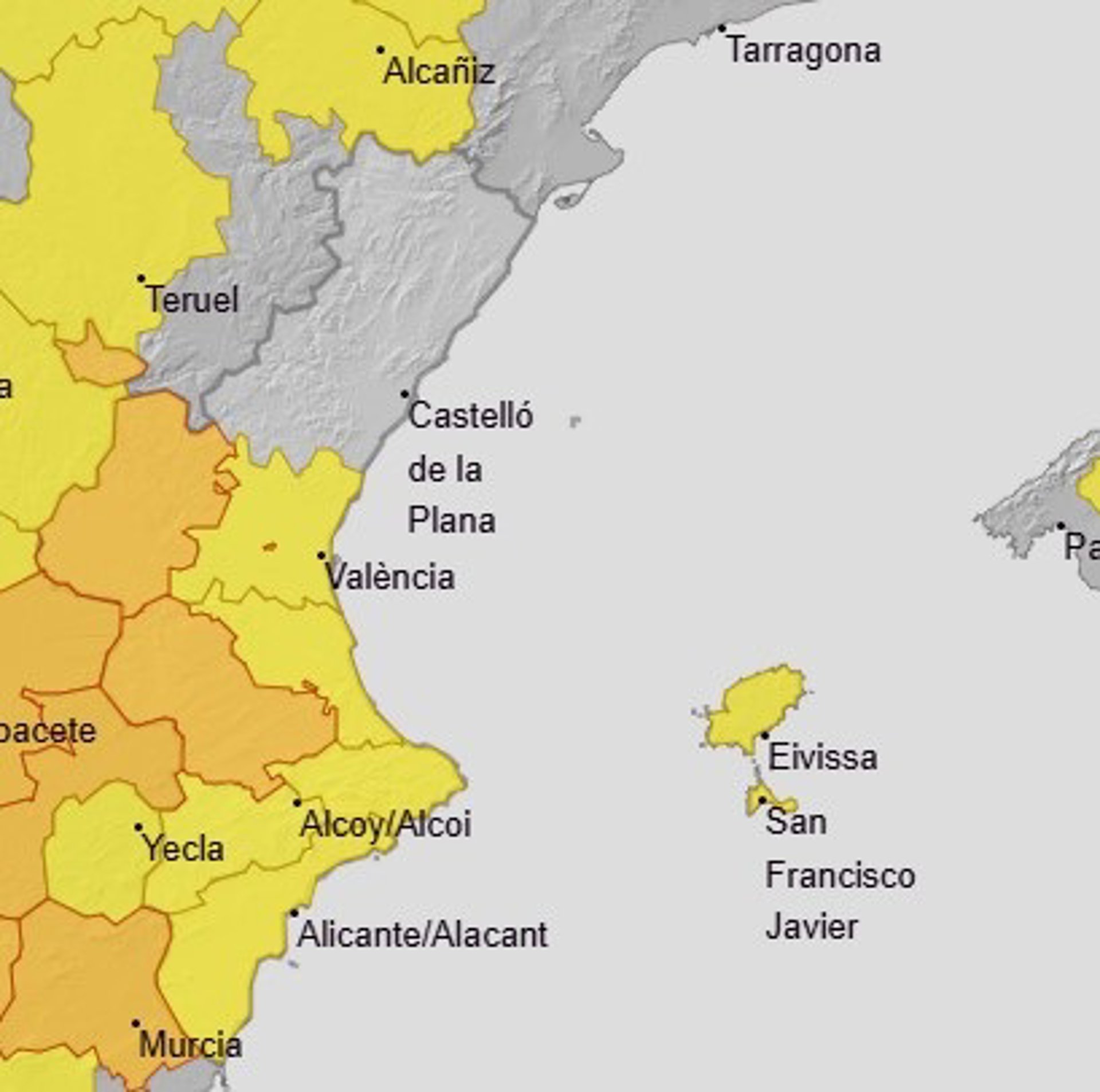 Más allá de estas ciudades, en la provincia de Ontinyent marca una máxima de 41ºC y Requena de 40ºC. También hay valores elevados en el interior de Alicante, con una máxima de 40ºC en Orihuela y de 38ºC en Alcoi. Algo más suaves son las máximas de Castellón, con 34ºC en la Vall d'Uixó o 31 grados en Morella y Vinaròs.