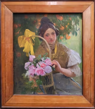 Presente en colecciones como el Museo del Prado o el Museo San Pío V, Fillol representó numerosas escenas populares de ambientación valenciana, como la presente obra, que muestra una joven chica vestida de valenciana, sosteniendo un cesto con rosas en un paisaje de naranjos.